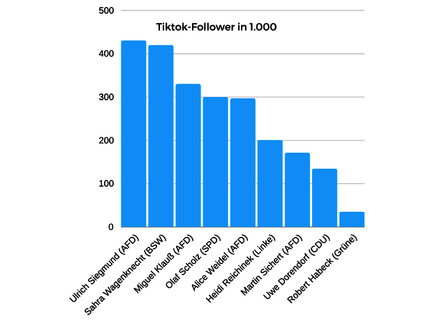 Siegmund ist AFD-Abgeordneter und Fraktionsvorsitzender im Landtag Sachsen-Anhalt. Er hat über 430.000 Follower auf TikTok. Platz eins unter deutschen Politikern. Mithalten kann da nur Sahra Wagenknecht mit 420.000. Olaf Scholz kommt auf 300.000, Robert Habeck auf 35.000. Bei den Accounts der Bundestagsfraktionen sieht es ähnlich aus.
